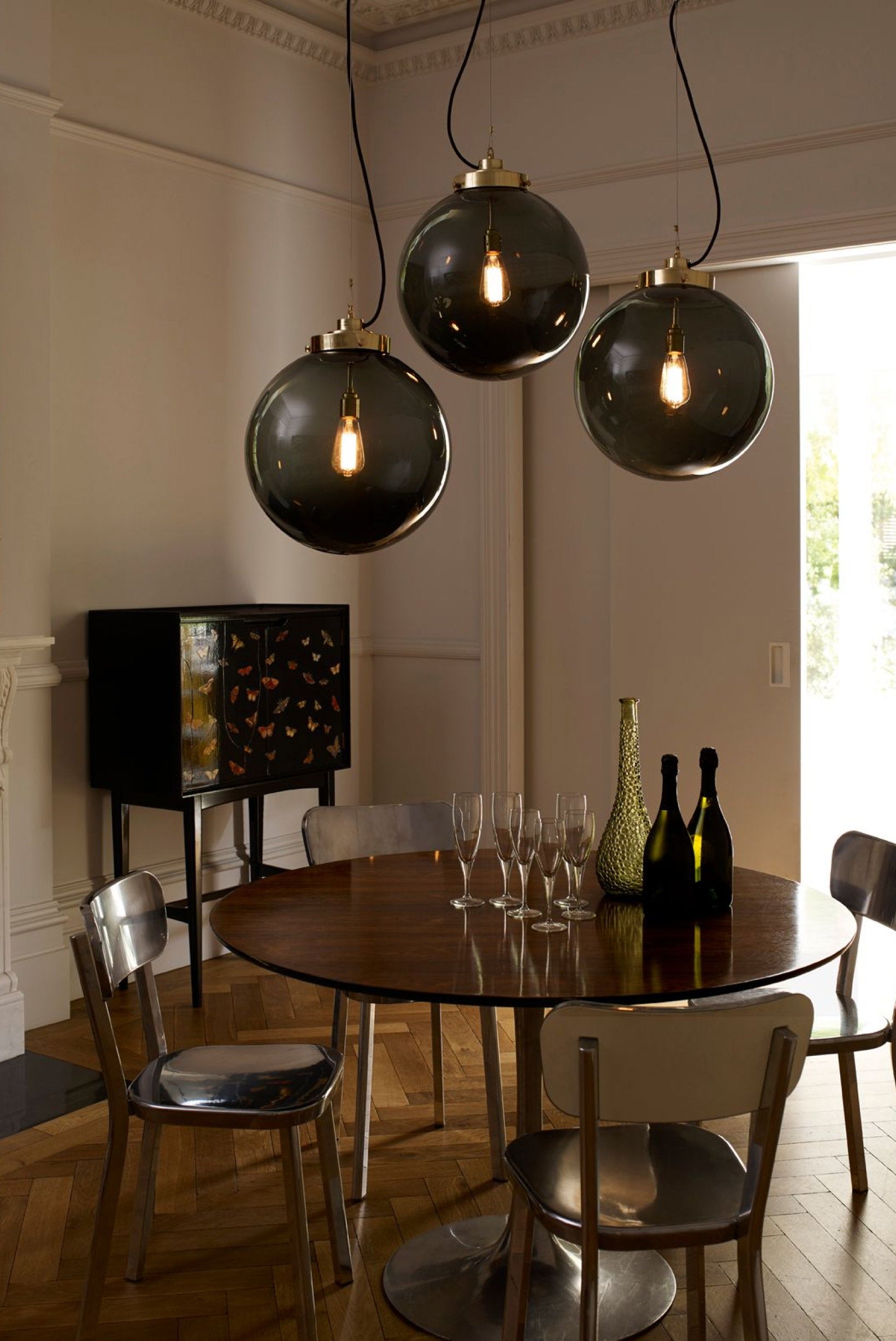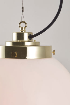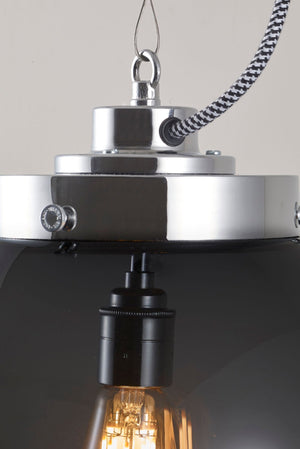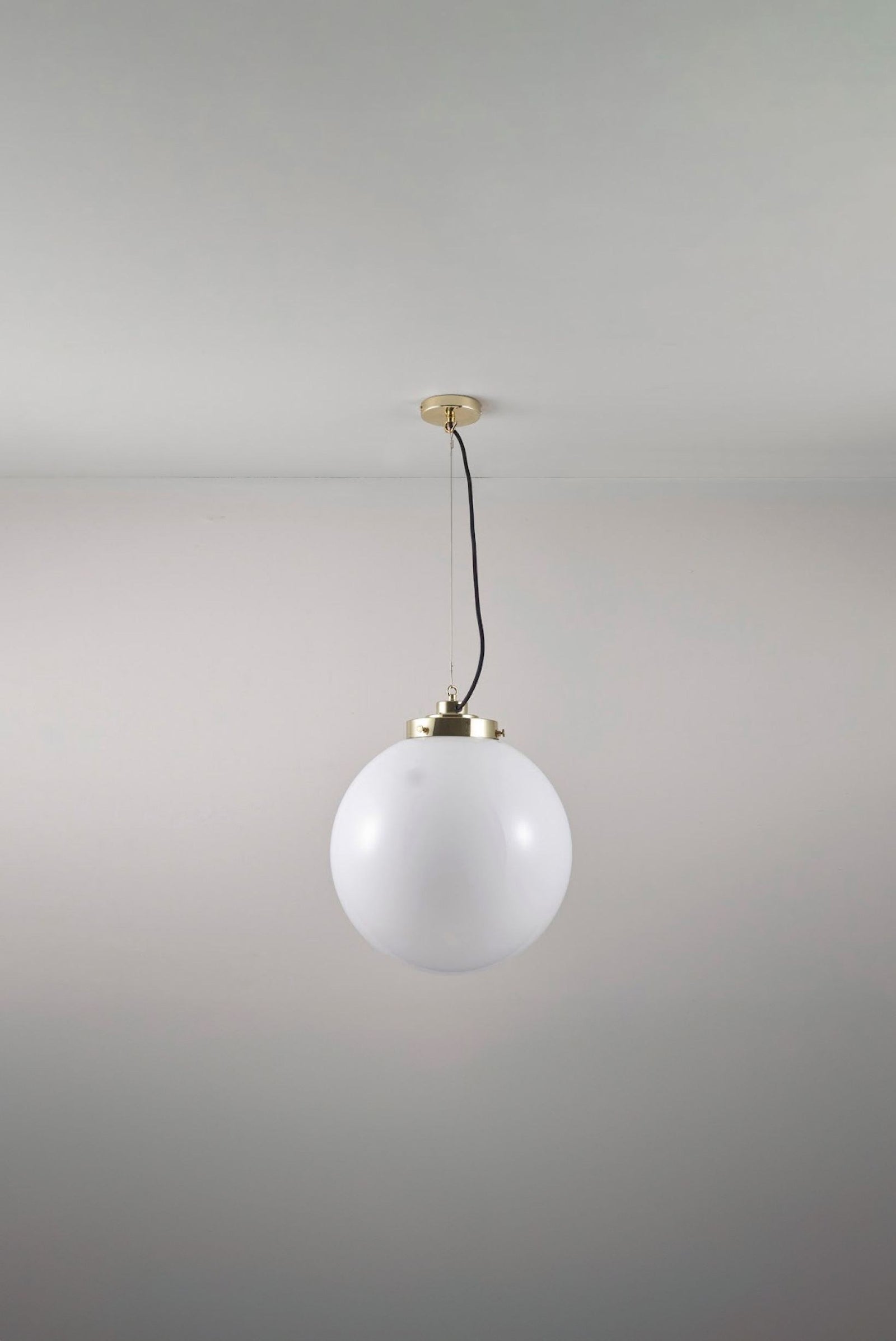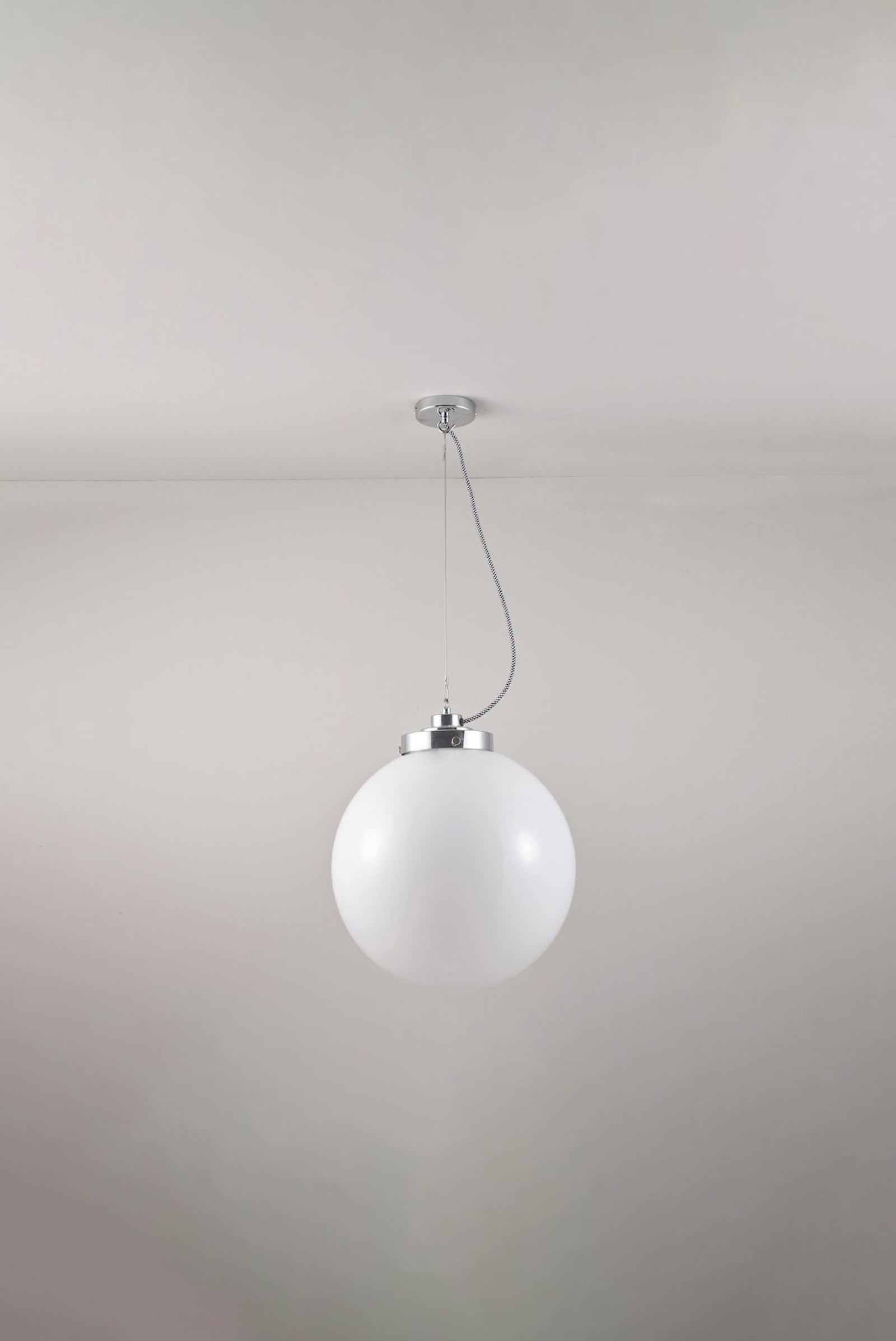 An elegant glass Globe Pendant that really packs a punch. Available in three different sizes and in two glass finishes. Choose between an opal or anthracite glass shade, with polished chrome or brass metalwork. The exposed squirrel cage light bulb adds contemporary style and the black & white cotton braided cable complements the design nicely.
