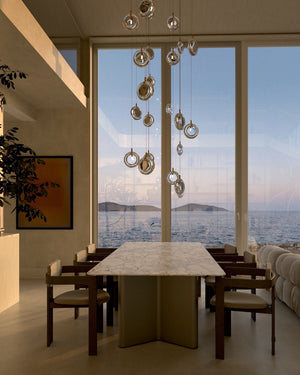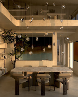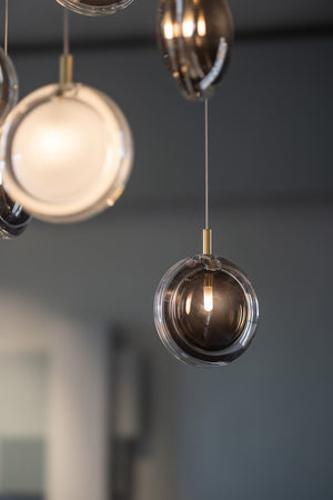 Light refracted through a lens is a fundamental principle of optics. Here, two lenses harmoniously encapsulate their interior source, playing a monumental symphony of lights, tone by tone. This BOMMA collection is exceptional in its design and material selections, as well as its potential to create unique lighting constellations. Thanks to our special hand-painting technique, the predefined colors of the Lens Collection may be additionally expanded to meet a color variation of your choice. The lighting’s hypnotic design, along with the delicate detail of its canopy, ensures that the collection forms a notable and supremely elegant interior element.