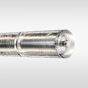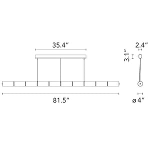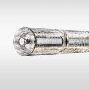The cylindrical transparent glass modules are created through an artisanal process by pouring the glass into a rotating mold to obtain an exclusive finish that makes each single piece unique. Internal structure in polished extruded aluminum equipped with two linear LED modules for direct and indirect lighting downwards. The modules can be easily removed and replaced in case of maintenance.The power supply unit and the Dali Dimmer are located within the ceiling rose while a touch control button, positioned on one end of the product, allows the luminaire to be controlled in three different modes.