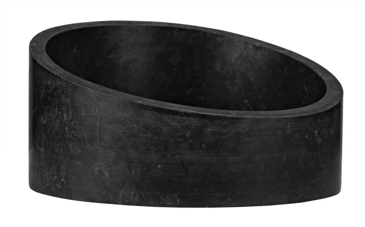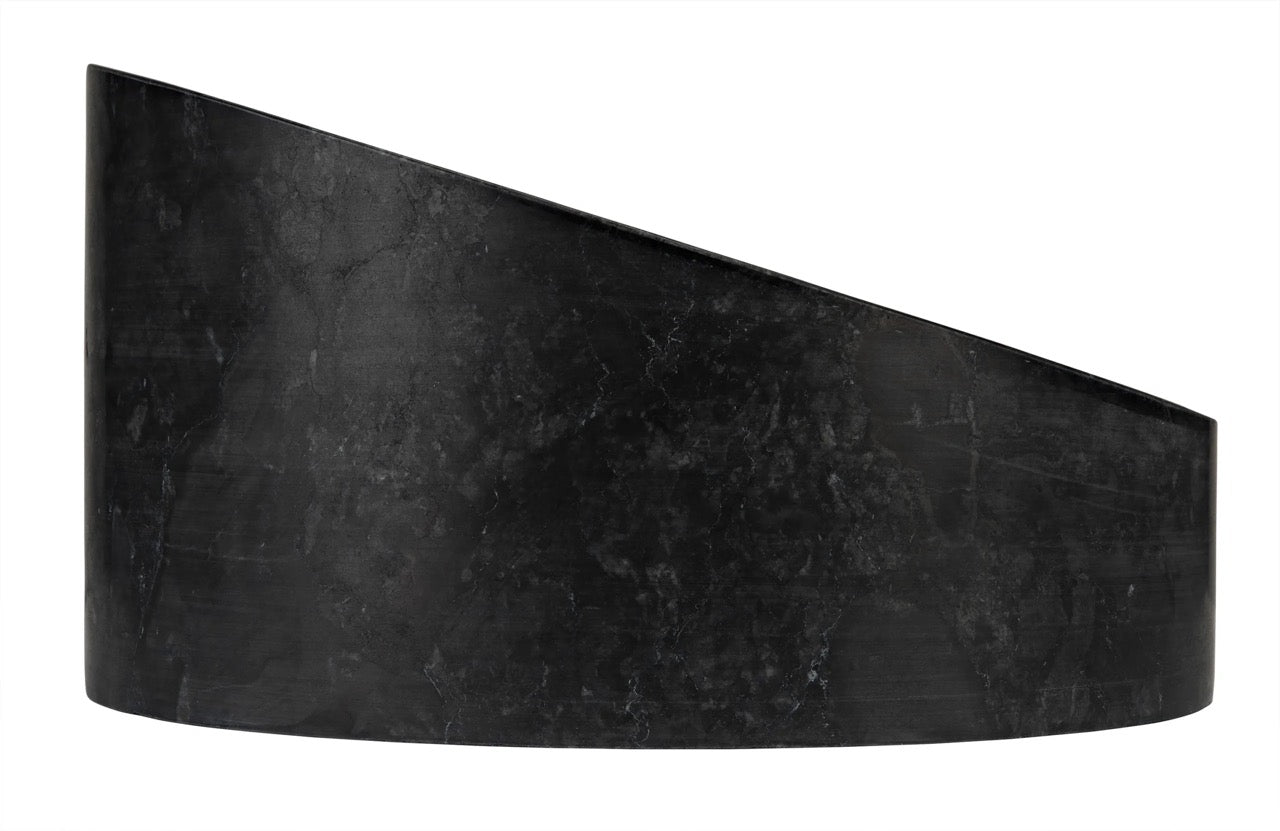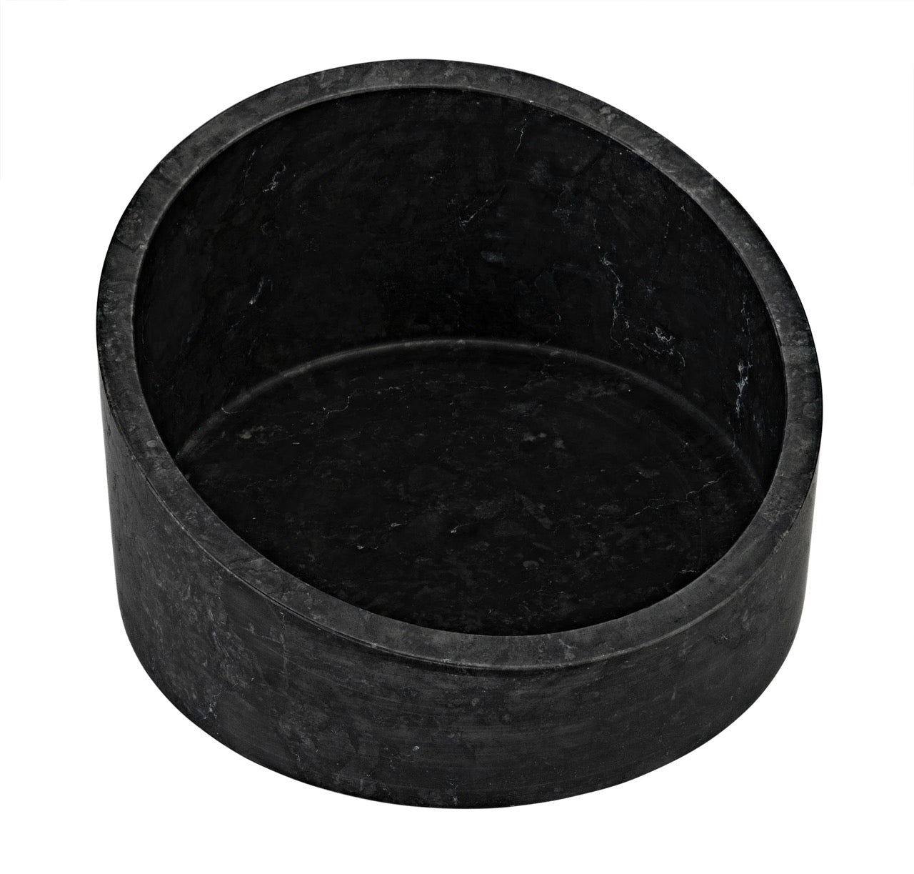 Subtly grained black marble reveals its natural variances in this bold cylindrical shape container with angled edge. A catch-all, a vase, a centerpiece, a simple but bold statement, the choice is yours! Artisan crafted of solid black marble and designed with simple lines to allow the natural material center stage. The stone we work with was chosen for the beauty of its natural striations and veining. No two pieces of marble are the same, and each of our marble objects will therefore be unique to themselves.