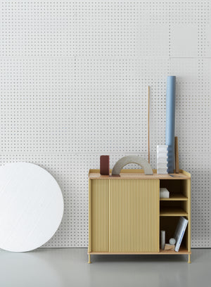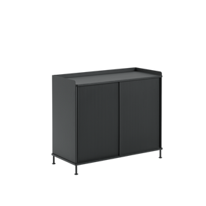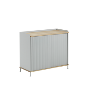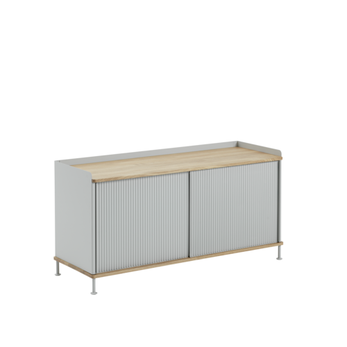 The Enfold Sideboard combines industrial materiality with residential references for a new perspective on modern storage. Made from a lacquered steel that gently enfolds its top and bottom in solid oak, the Enfold Sideboard fuses cold and warm materials for a unique expression, paired with the vibrantly modern expression of its ridged steel doors. The flexible design is available in four sizes, which all have adjustable shelves and discreet cable outlets. This offers the opportunity to find just the right fit for your space, function and needs — be it a media console, in the hallway or a tall sideboard for storage.