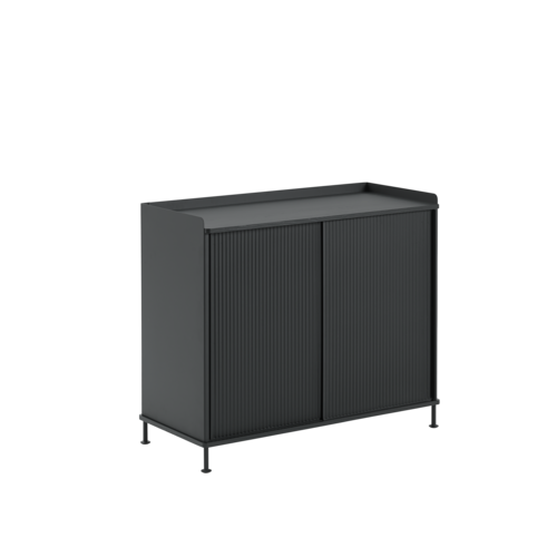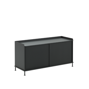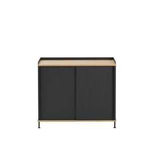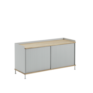 Body, shelves and sliding doors in powder-coated bent steel. Top and base in solid oak treated with a clear oil (Size 186 x 45 H:48 cm and 148 x 45 H:85 cm as well as all sizes in Oak / Deep Red) or matte clear lacquer for other variants. Adjustable feet. Size 186 x 45 H:48 cm and 148 x 45 H:85 cm as well as all sizes in Oak / Deep Red are FSC™ certified (FSC-C028824). - Height:33.27"