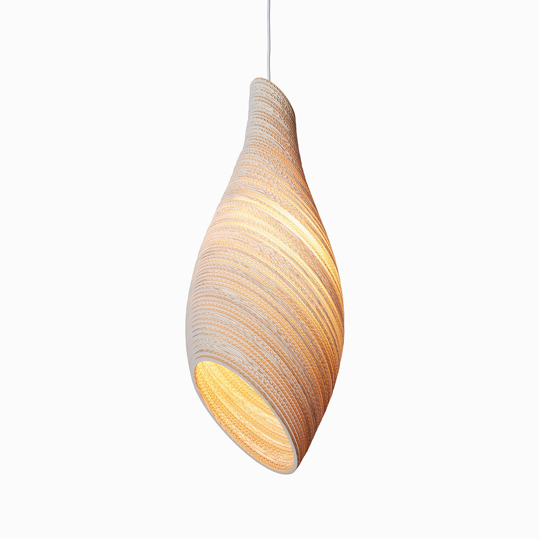 Scraplights are constructed from natural recycled cardboard precision cut by a laser. This gives the edges their classic dark appearance and enhances the warm light projected through the corrugation. The classic series includes many of the best-selling models such as the Moon and Disc, along with newer designs like the Hive and Nest.