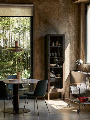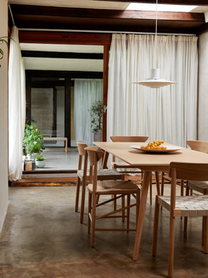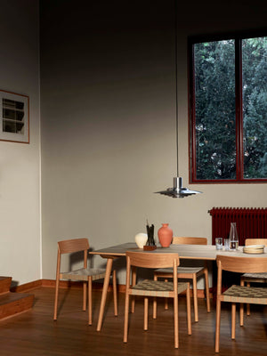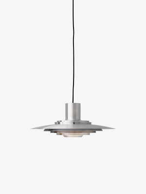 Originally conceived in 1963, the P376 is composed of five concentric shades which create gradations of curves towards the middle of the lamp to emit a soft, diffused light. With its distinct profile, the P376’s strong visual presence belies its effortless functionality and cohesive expression. Available in two sizes and finishes, the lamp creates a feeling of warmth and intimacy when hung above dining tables and communal spaces.