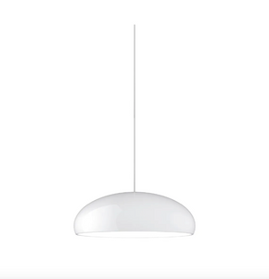 Suspension lamp with direct and dimmable light. Top diffuser made of painted metal. Bottom diffuser made of opaline polycarbonate. Transparent power cable. Chromed polycarbonate ceiling rose. Bulb not included.