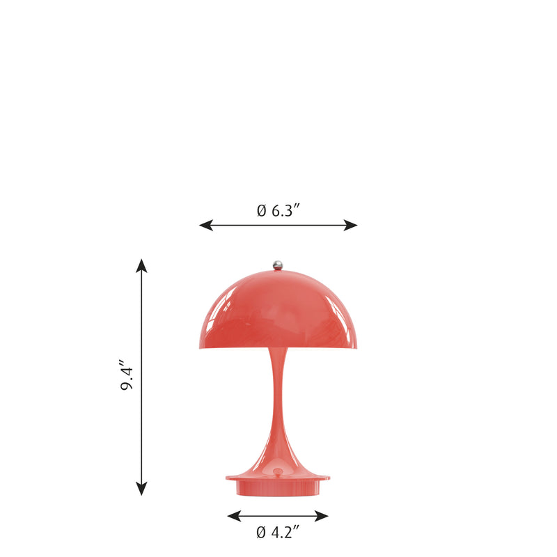 Black. Shade: Deep drawn steel. Base: Die cast aluminum. Cable length: 4.9 ft. Power: USB cable for standard USB adapter (Min. 1.5A) or QI wireless charger. White light indicator on base when charging. Light control: Switch on base. Batteries: 3 x AA NiMH , rechargeable and replaceable. Battery lifetime: 5 hours @ 100%. Step dim, short press: 0%/10%/33%/100%. Power off: Long press. Function to set a fixed light level. Please note that Panthella Portable comes with a USB cable but without adapter and QI charger. Separate USB adapter is available as accessory. Compatible with standard USB adapters (Min. 1.5A) and QI wireless chargers. IP44 classified. The lamp is fitted with an integrated energy-saving LED light source.