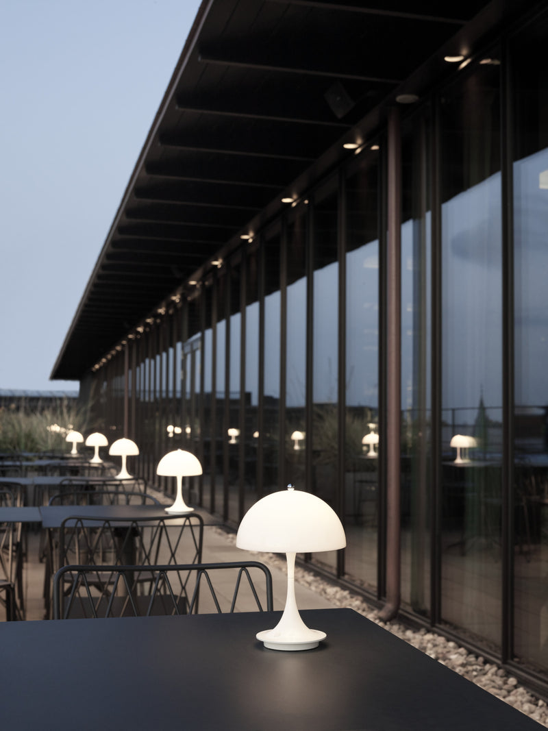 Originally designed in 1971, the Panthella has since become recognised as one of Verner Panton's most significant designs. The recognisable, soft organic shape of the table lamp is not only beautiful but also functional, with a hemispherical shade that directs light downward onto the trumpet shaped base, which reflects the light in a uniform manner. The Panthella 160 Portable is a petite and portable version of the classic Verner Panton design, with a shade that is just 160 mm in diameter. It is perfect for use around the home, as well as other locations.