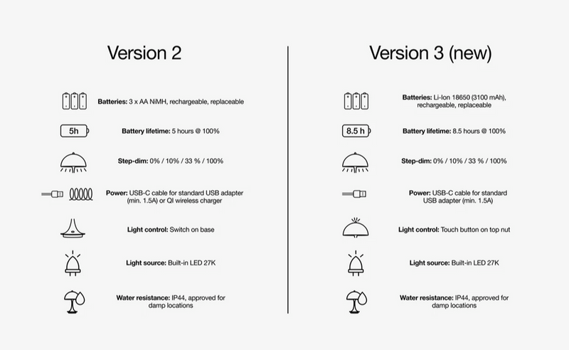 USB-C cable or Qi base for standard USB-C-A adapter. Light control: Switch on base. Battery lifetime: 5 hours @ 100%. Step-dim: 0%/10%/33%/100%