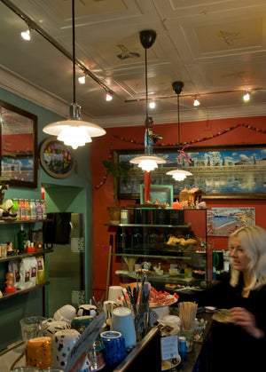 Mounting: Canopy: White. Cord type: 3-conductor, 18 AWG black PVC power cord. Cord length: 12’. Material: Shades: Handblown white opal glass (sandblasted on the undersides for uniform light distribution). Suspension: Black metalized or high lustre chrome plated, spun aluminum. Class: cULus, Dry location.