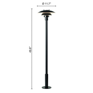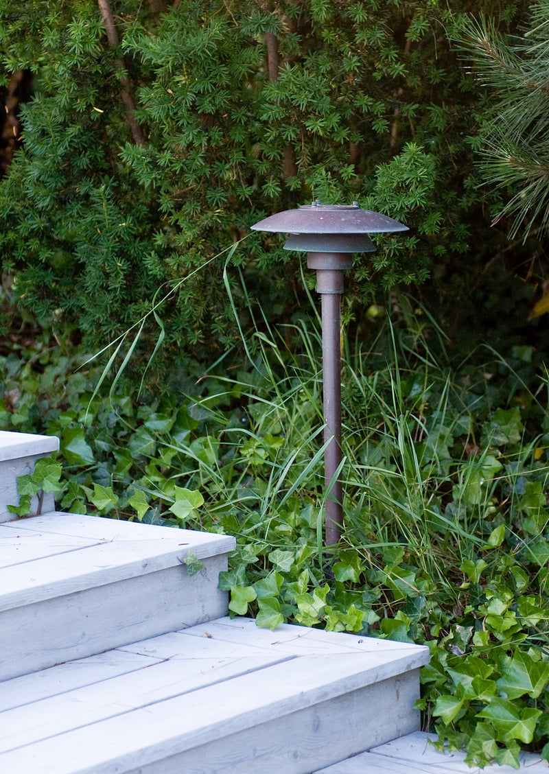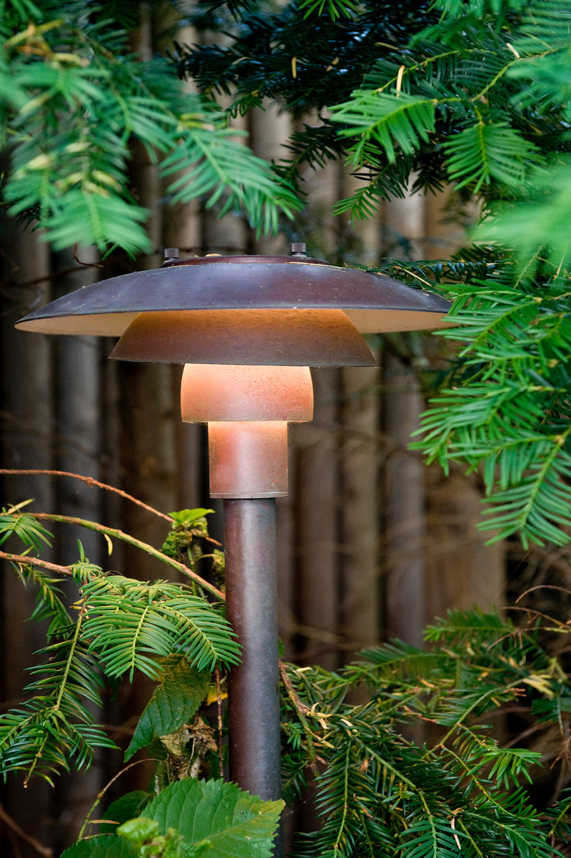 Material: Top shade: Spun stainless steel. Middle/lower shade: Spun stainless steel. Shadeholder: Die formed glass. Post: Stainless steel. Base plate: Stainless steel. Class: cULus, Wet location.