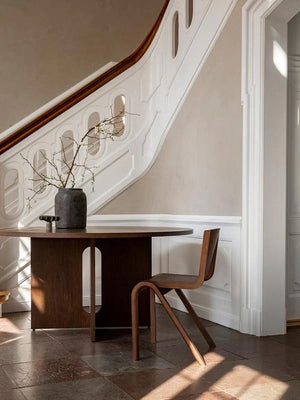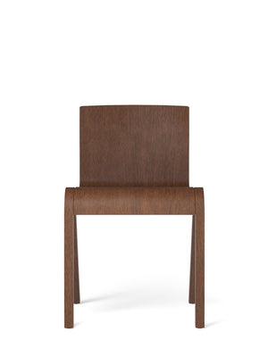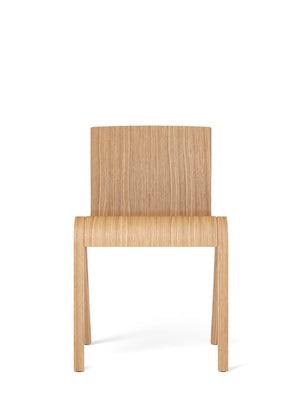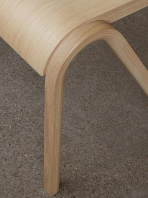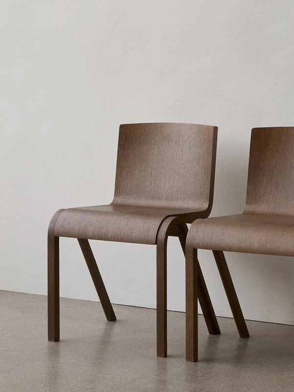 The result of a study of the possibilities of form-pressing techniques, Ready Chair, created for Audo by Matias Møllenbach and Nick Rasmussen, takes its cues from classic free-swing chair designs, its cantilevered seat and backrest appearing as if suspended on air. Available in FSC™-certified oak veneer, it comes with a natural or red stained oak finish and with the option of an upholstered seat and back. Perfectly sized for use as a dining chair, its stackable design and row-connecting feature make it equally suited to a multitude of other uses.