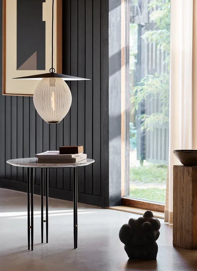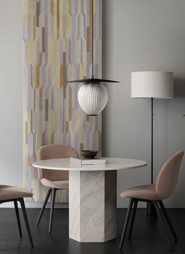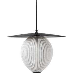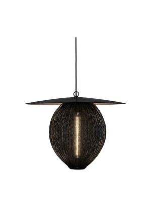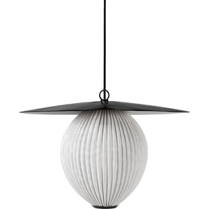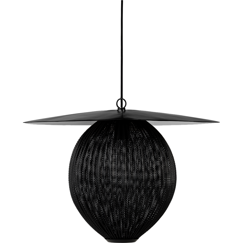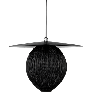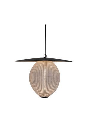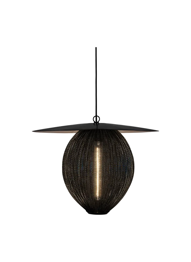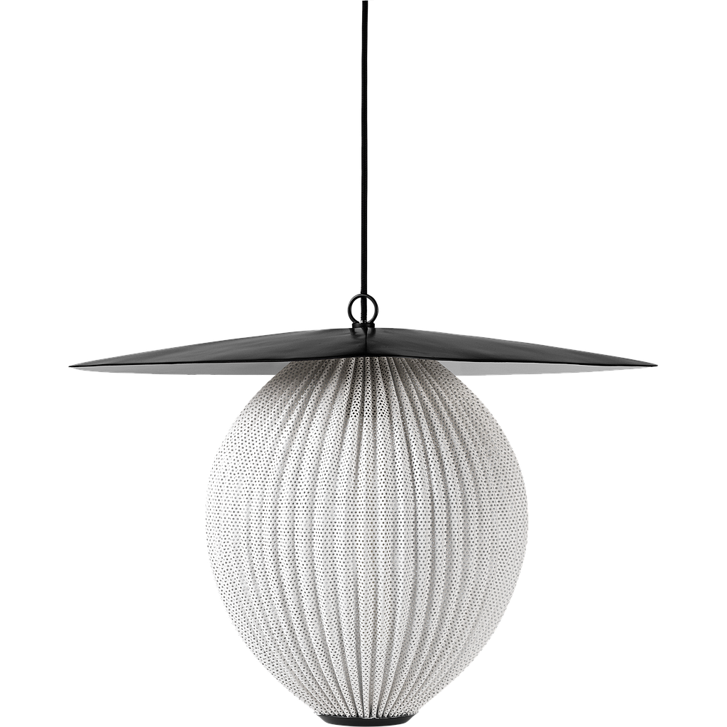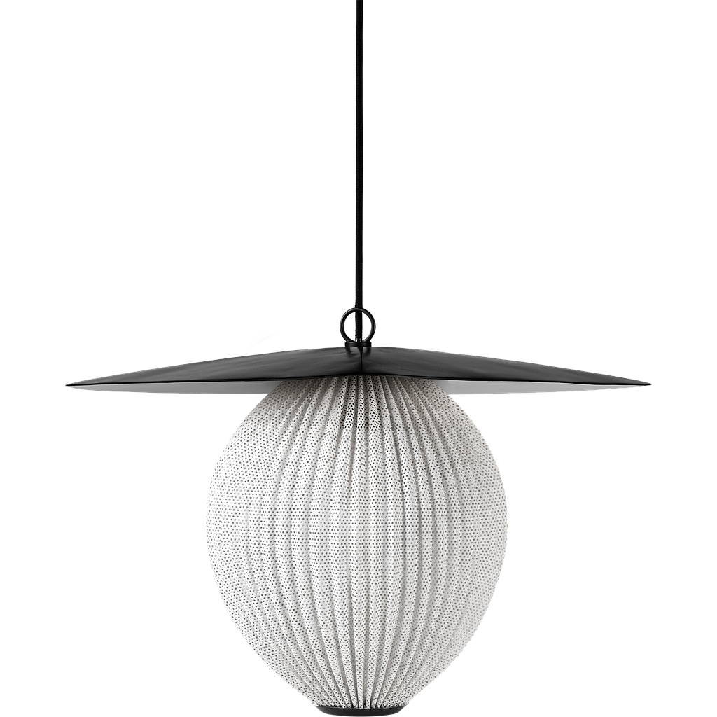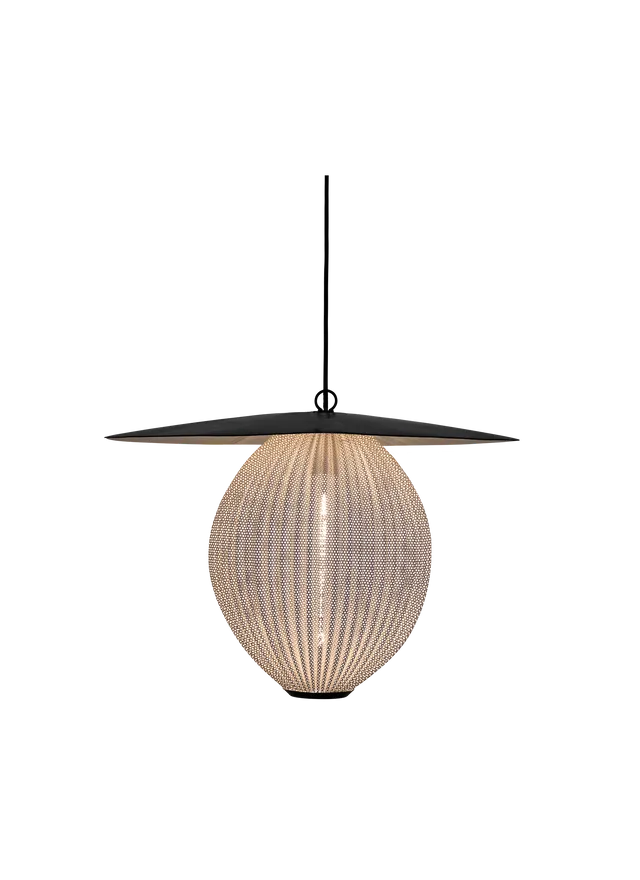 The Satellite Pendant of two sizes is designed by Mathieu Mategot in 1953 with geometrical shapes and an organic shade to create outstanding sculptural aesthetics. The name, Satellite, was given by Mategot as a wink and tribute to the scientific progress in France in the years after the Second World War.The Satellite Pendant holds the distinctive trait of Rigitulle, a technique and material invented by the designer himself that makes it possible to bend and fold the fabric-like metal sheet to an original, oblong-shaped pendant lamp. The lampshade has five colour options; midnight black, white cloud, shy cherry, venetian gold and rainy grey, and is unique with its bulb all covered by perforated metal to exude an atmospheric light - creating a festive appearance. The interplay of light and shadow cast on walls and floors generate a dramatic feature in any dining room, hallway or restaurant. Hang the Satellite Pendant alone as a character piece or in multiples to create a cloud of luminosity.