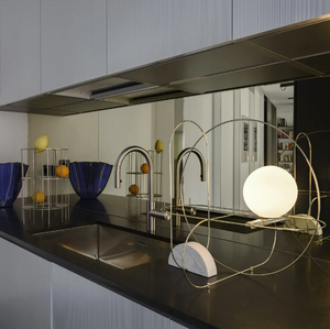 This is the name of the family of lighting fixtures that Francesco Librizzi, a young Sicilian architect working in Milan, has designed for the first time for FontanaArte. Setareh was born of the idea of giving form to light. The lamp is composed of a sphere magically suspended within a thin metal structure. The play of circular masses and trajectories generates a balanced design of gravitational dynamics. The light from the sphere is diffused into the surrounding space, illuminating the frame. The reflections of the metal render the luminous field visible, space influenced by light, by its aura. The result is a collection of lighting elements, available in tabletop and suspension versions, of extraordinary poetic grace. Setareh takes on new dimensions: elongated, with either two or three spherical elements that work separately or together. Its vocation is the illumination of large spaces, with double-height ceilings or otherwise ample enough to accomodate expansive compositions of multiple elements. A firmament of Setareh, ‘star’ in the ancient Farsi language.