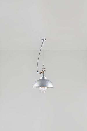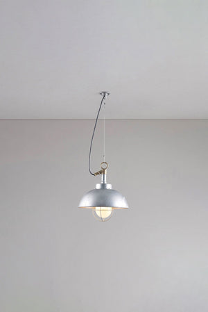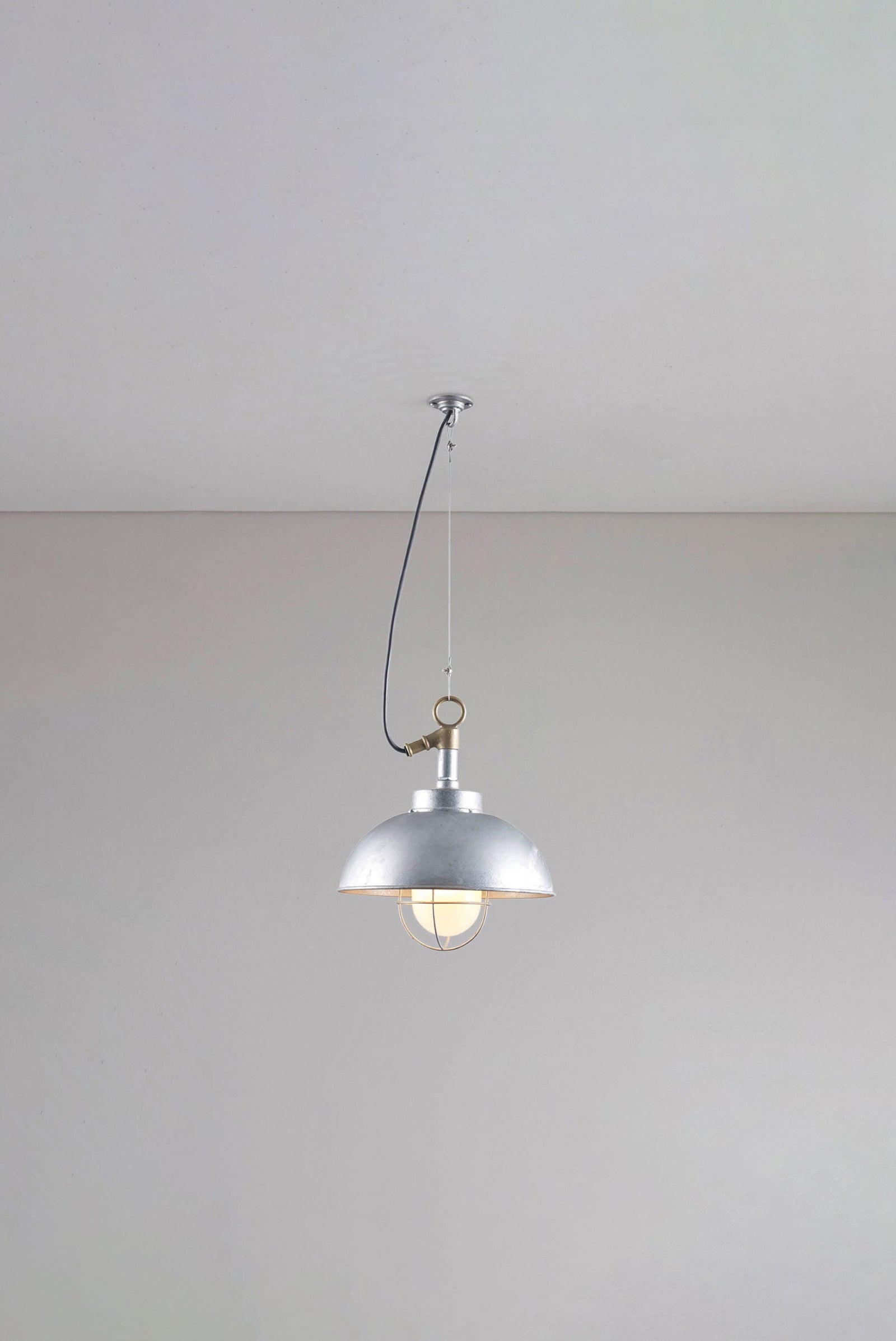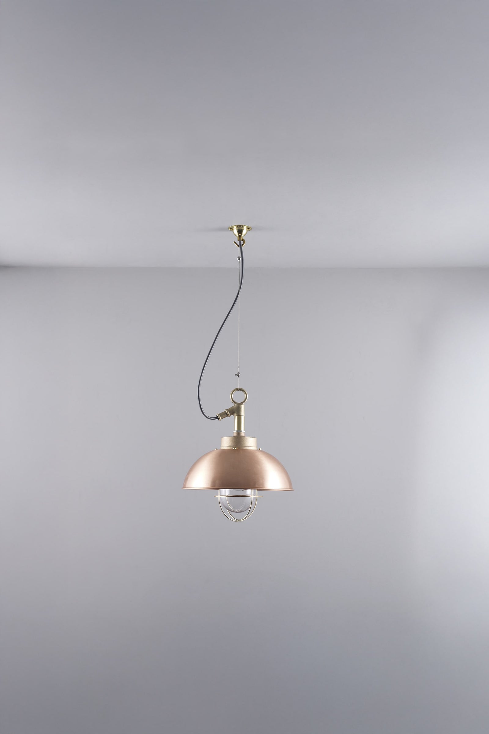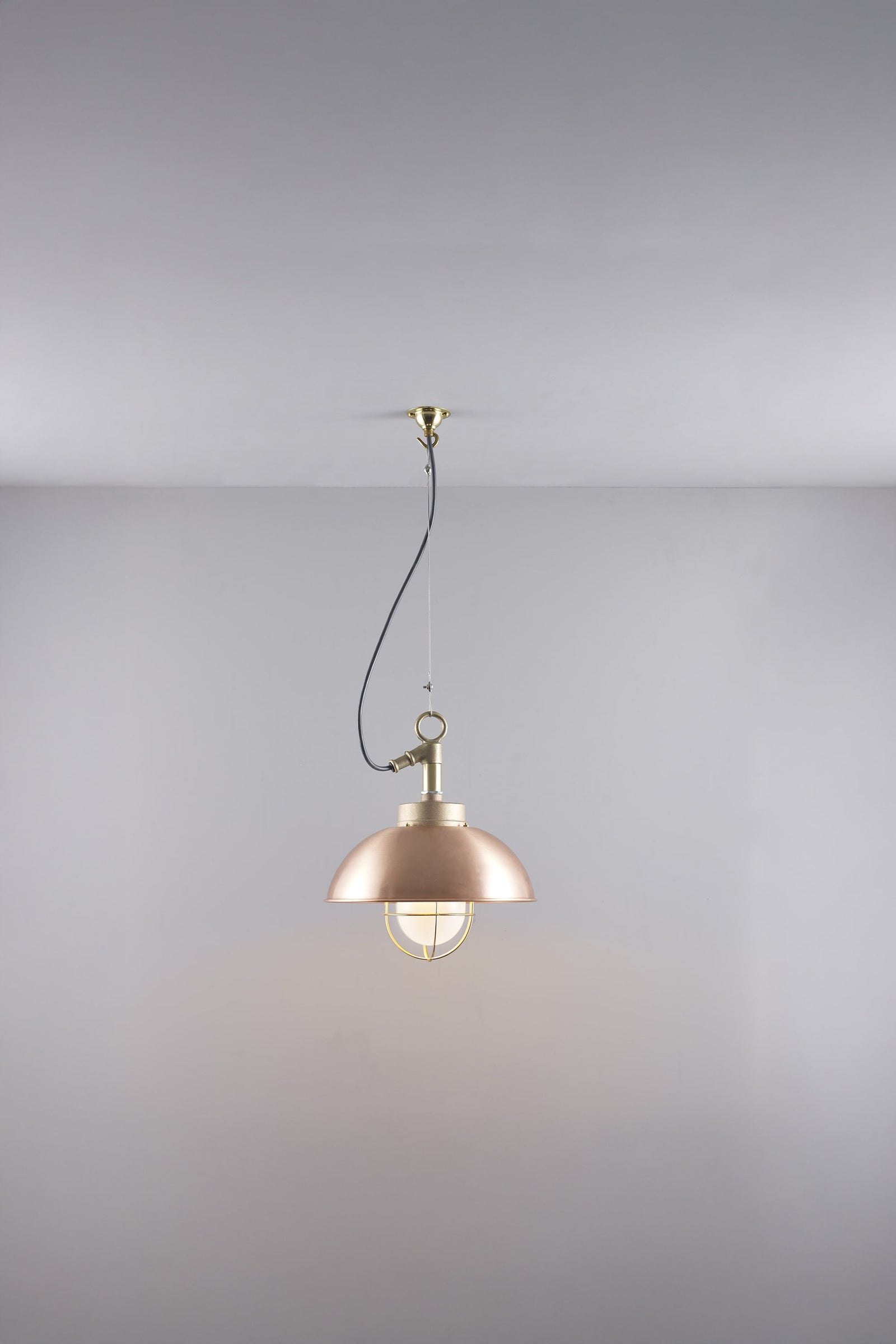 Davey's Shipyard Pendant is a highly engineered cast brass fixture with a strong copper or glavanised reflector. It features a heavy gunmetal crown and sturdy wire guard with clear or frosted well glass fitted. IP44 rated, this pendant is an ideal lighting solution for exterior spaces.