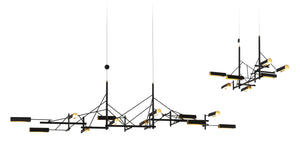 Tinkering, designed by Joost van Bleiswijk, captivates its spectators through a rhythmic composition that is made from black coated stainless steel and brass. This suspension lamp is available in two sizes, Tinkering 85 and Tinkering 140, which feature 7 and 12 LED light sources, respectively. The light caps are individually adjustable and make this lamp suitable to be installed above a table or a desk. Tinkering is powered through Electrosandwich® technology by Marcel Wanders.