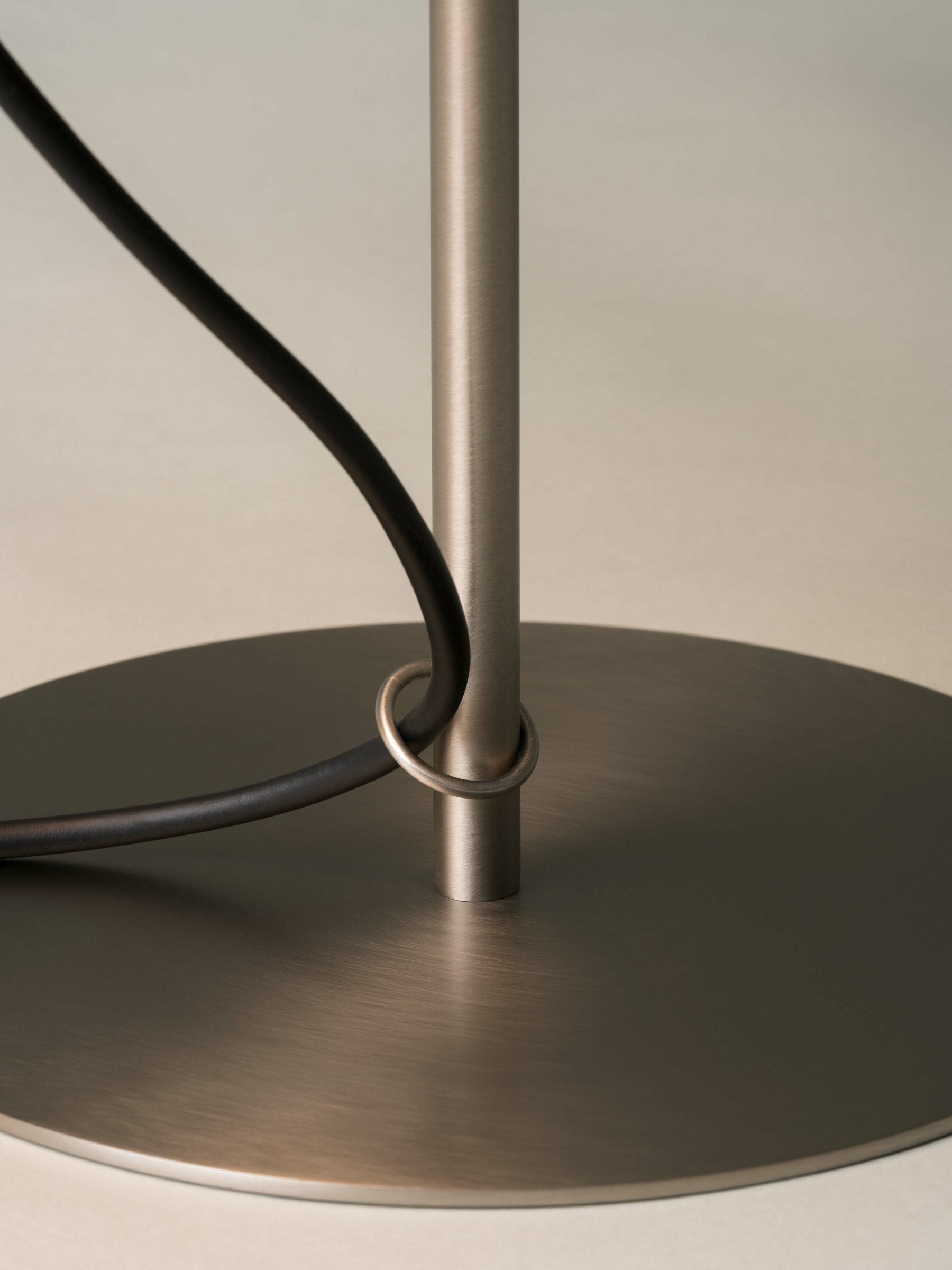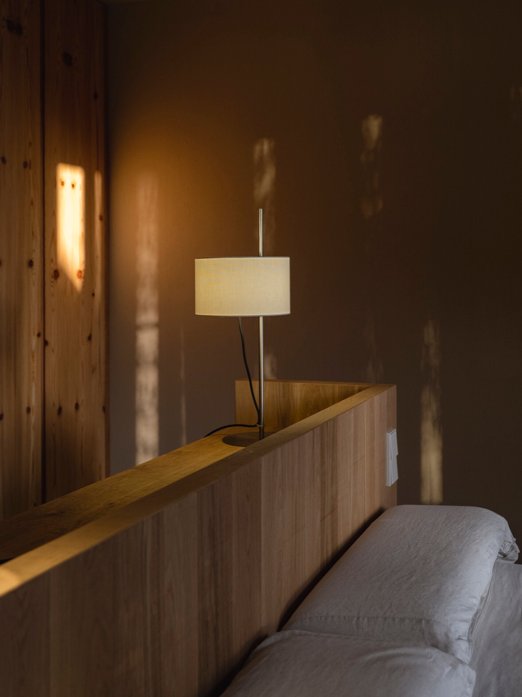 In order to reduce the number of sections, he replaced wood with metal and the cross-shaped base for a circular one, taking up less space on a crowded desk. The inventive engineering remains the same - the shade's height is adjustable via a rubber band stopper, and the light is switched on/off by pulling lightly on the cable. A thin metal ring is used to wrap and direct the cable along the shaft. The elegant lampshade, made of white linen fabric, creates a warm ambient light. With this exquisite blend of materials, the TMD lamp adds warmth to any room, even with the light off.