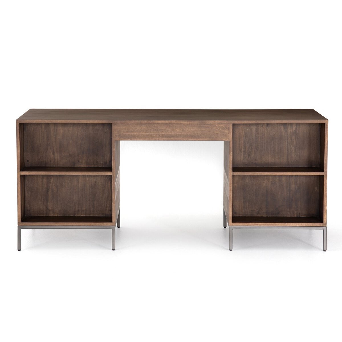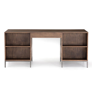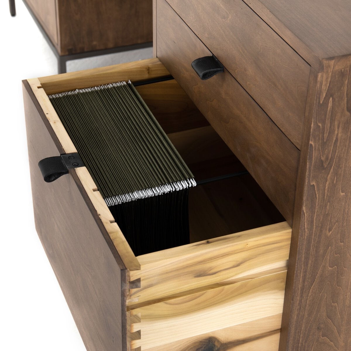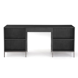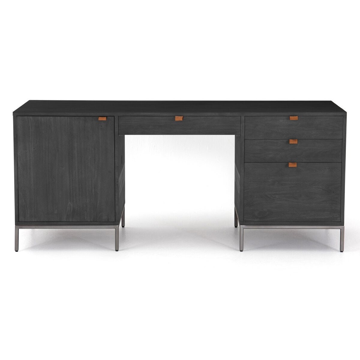 Inspired by clean mid-century design, black-washed poplar offers plenty of desk storage by way of spacious drawers including one perfectly sized for file storage of legal and letter sized documents. Metal-secured leather pulls add a textural element of surprise. Cutouts for cord management.