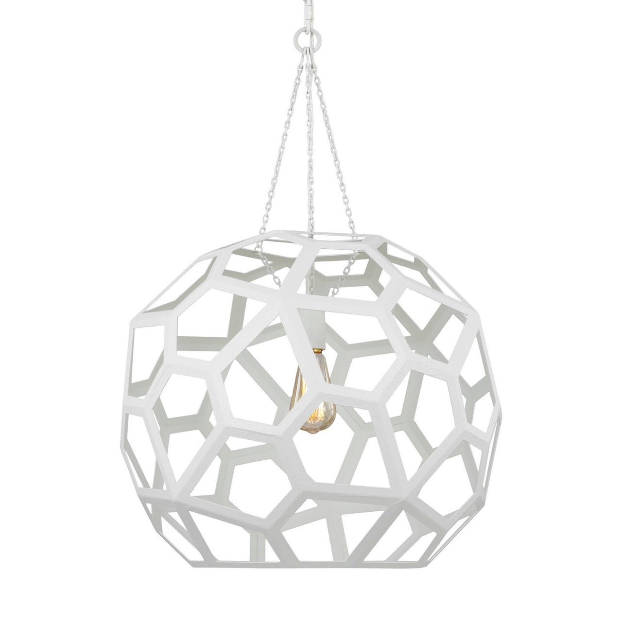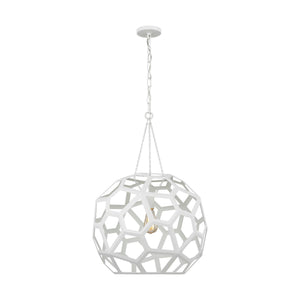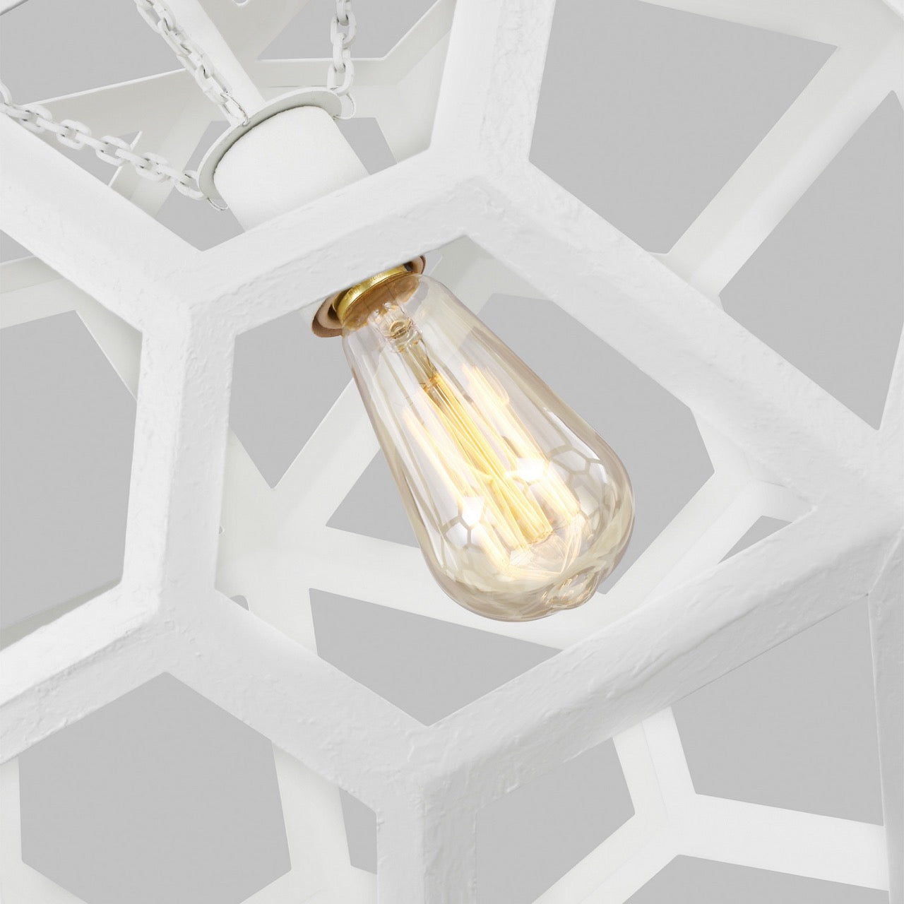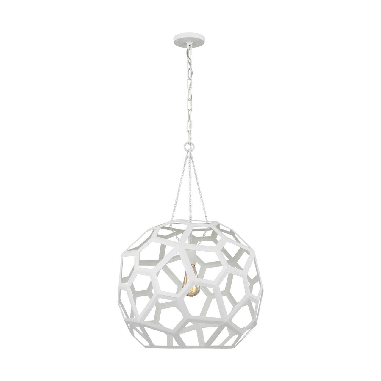 The Alexa Hampton Feccetta one light indoor pendant in antique gild is elegantly charming with a Mid-Century Modern appeal. The fixture is suspended by matching polished brass chain links, and both the shade and socket are held by three smaller chain links. The combination of its circular form with hexagonal shaped cut-out frame, illuminates light from any choice of lamping and can be elegantly placed as the focal point over an island or kitchen table. Alexa Hampton is an industry force who honors tradition and commits to the future, providing smart, stylish, design-rich solutions for every aspect of the home.
