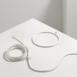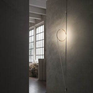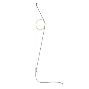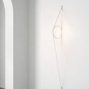 An exercise in reduction, stripped back to its most essential elements, offering beautifully rendered light from a spectacular wall sconce like you have never seen. The wire holds a simple ring fitted with an LED strip. The cable and ring are available in different color combinations and a range of finishes. Inspiration behind the design: Elevating what is hidden, showcasing the lamp's wire, we appreciate its sculptural beauty.